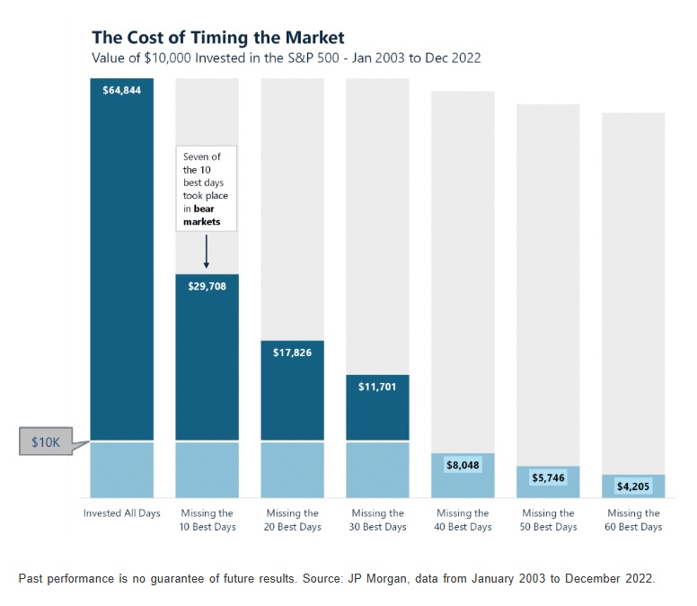 - Resist letting short-term volatility derail your long-term plan — the value you might miss by stepping out can be substantial.